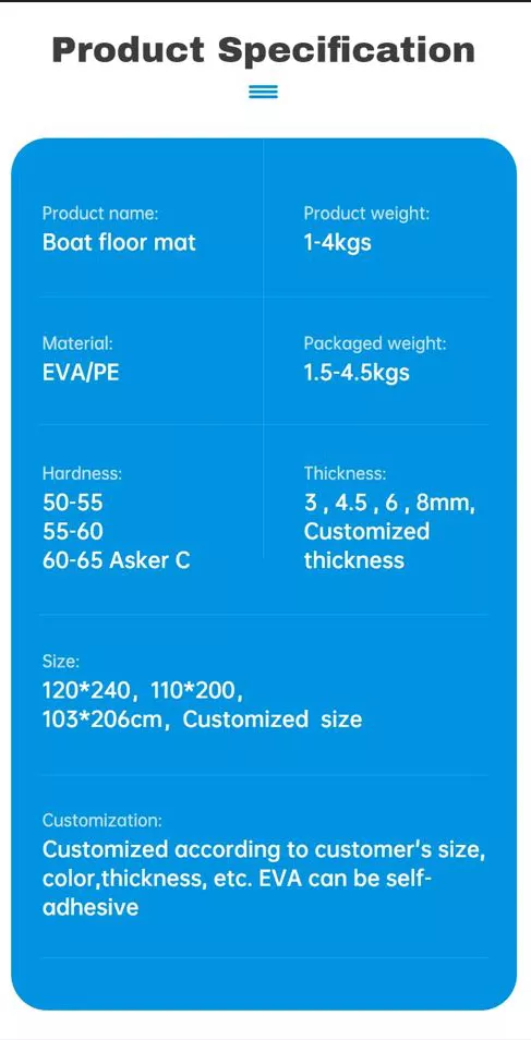 ProductSafe and Durable: The foam boat flooring is made of high-density PE/EVA foam, which is non-toxic and odorless, durable and not easily deformed, faded or damaged.